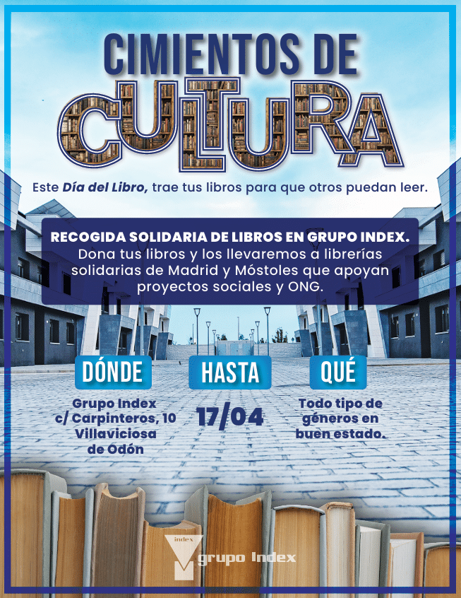 Con motivo del Día del Libro, que se celebra el próximo 23 de abril, desde Grupo Index queremos promover una acción solidaria que implique a empleados, clientes, colaboradores y vecinos. Así nace ‘Cimientos de Cultura’, una iniciativa para recoger libros en buen estado y ofrecerles una segunda vida y cuyos beneficios se destinarán a proyectos sociales y ONG.