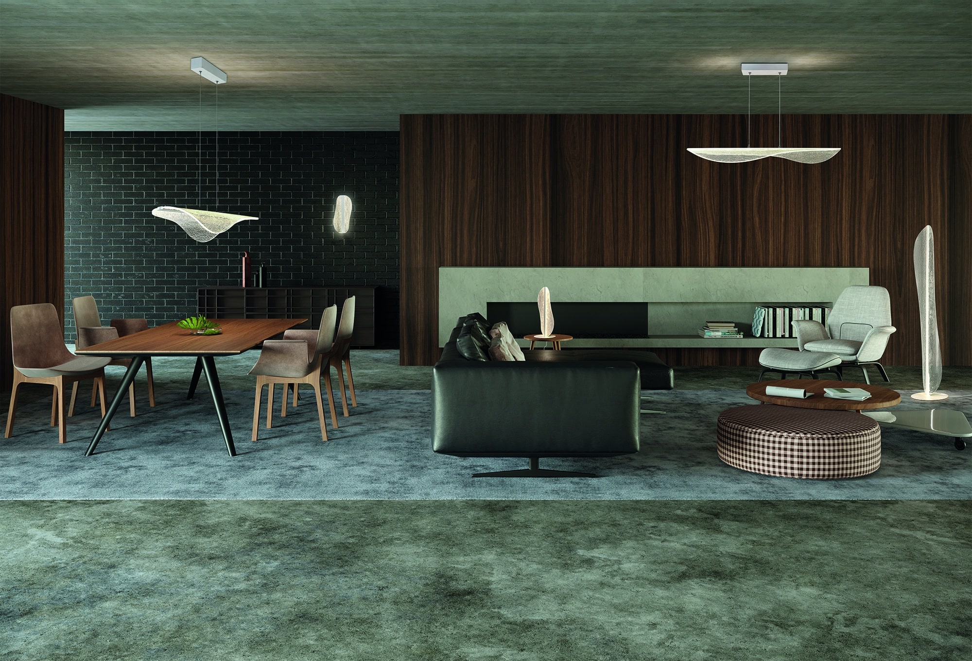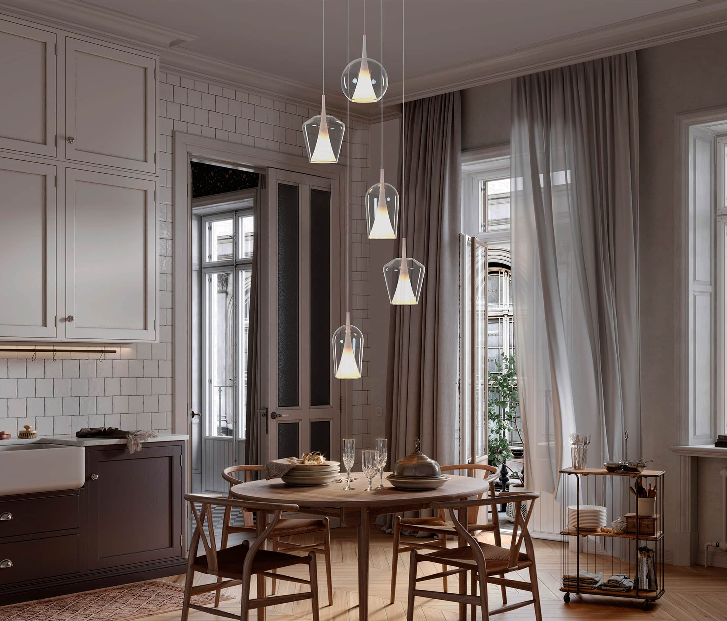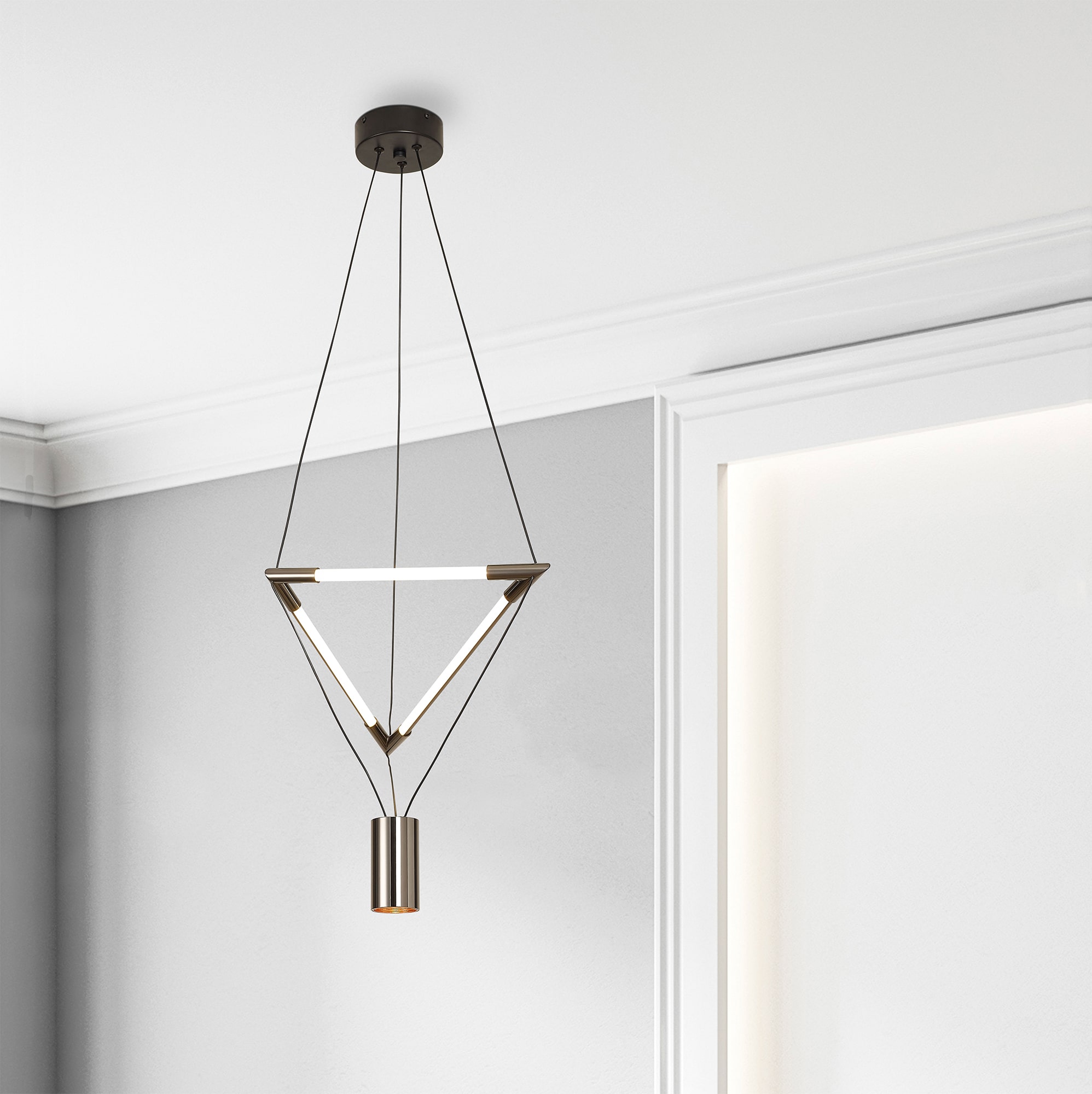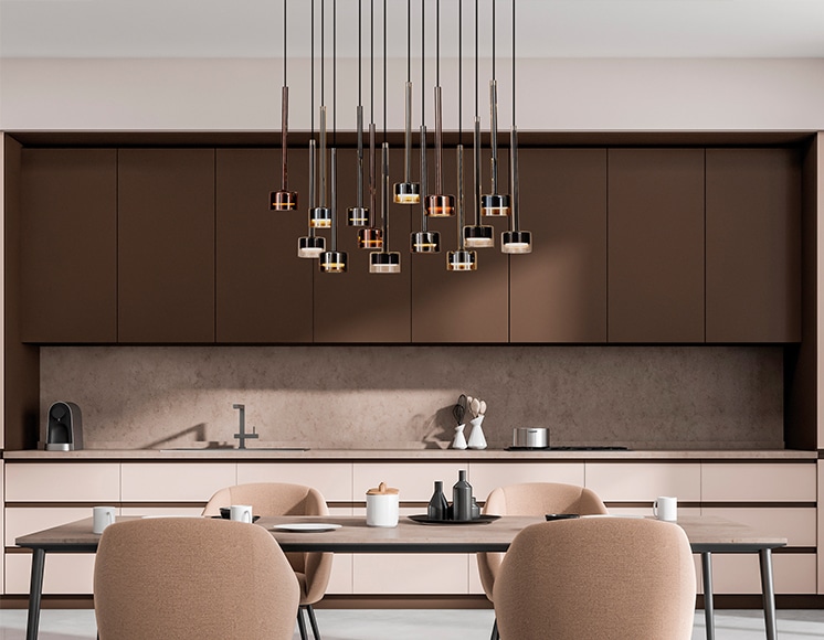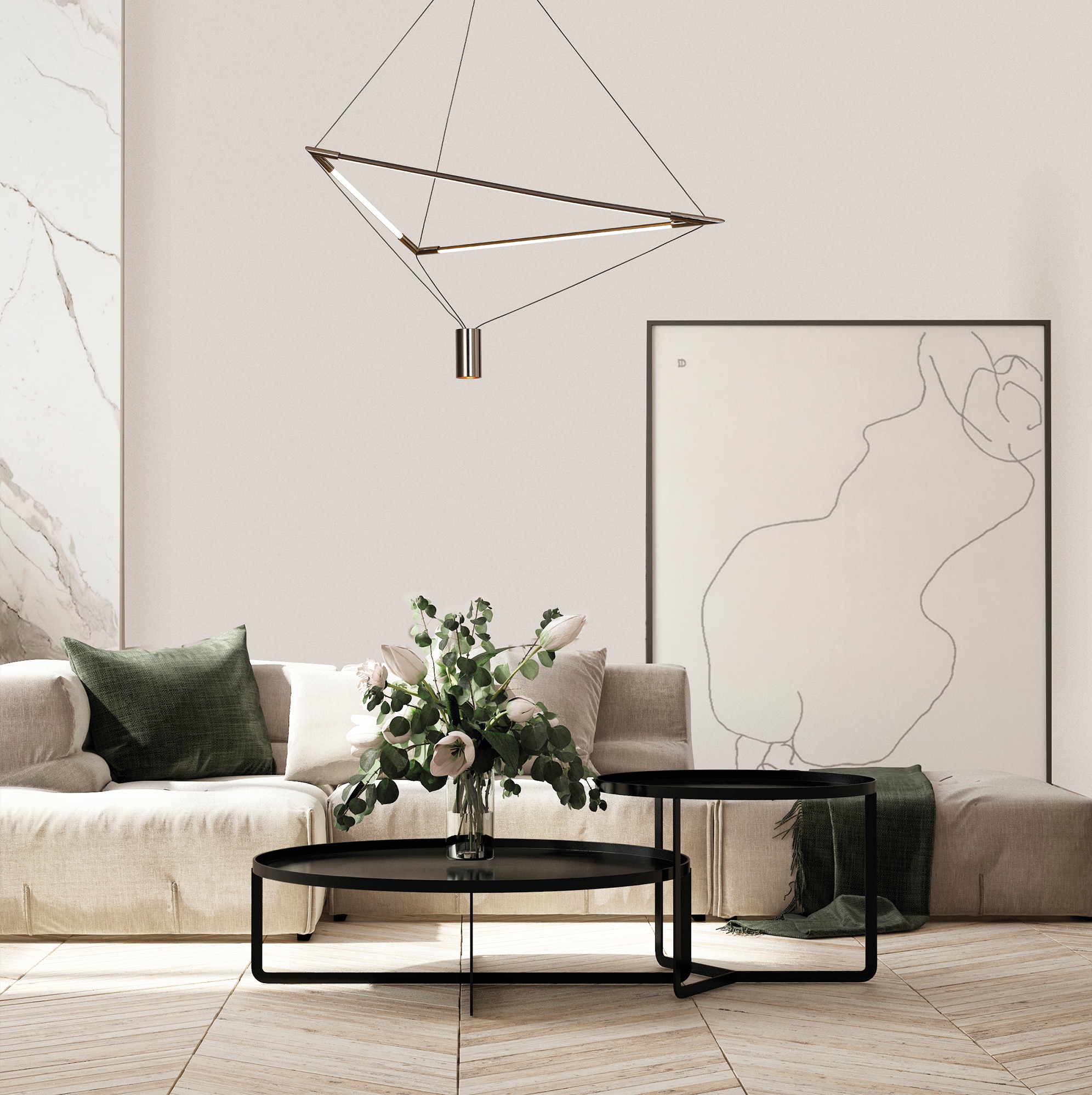 Estas lámparas destacan por sus formas puras y arquitectónicas: triángulos, cubos, esferas, prismas y estructuras lineales que aportan un aire escultórico al techo. Su inspiración proviene tanto del minimalismo escandinavo como del diseño industrial, pero reinterpretado desde una mirada contemporánea. El resultado son piezas que no solo iluminan, sino que también definen la atmósfera y el carácter del espacio.