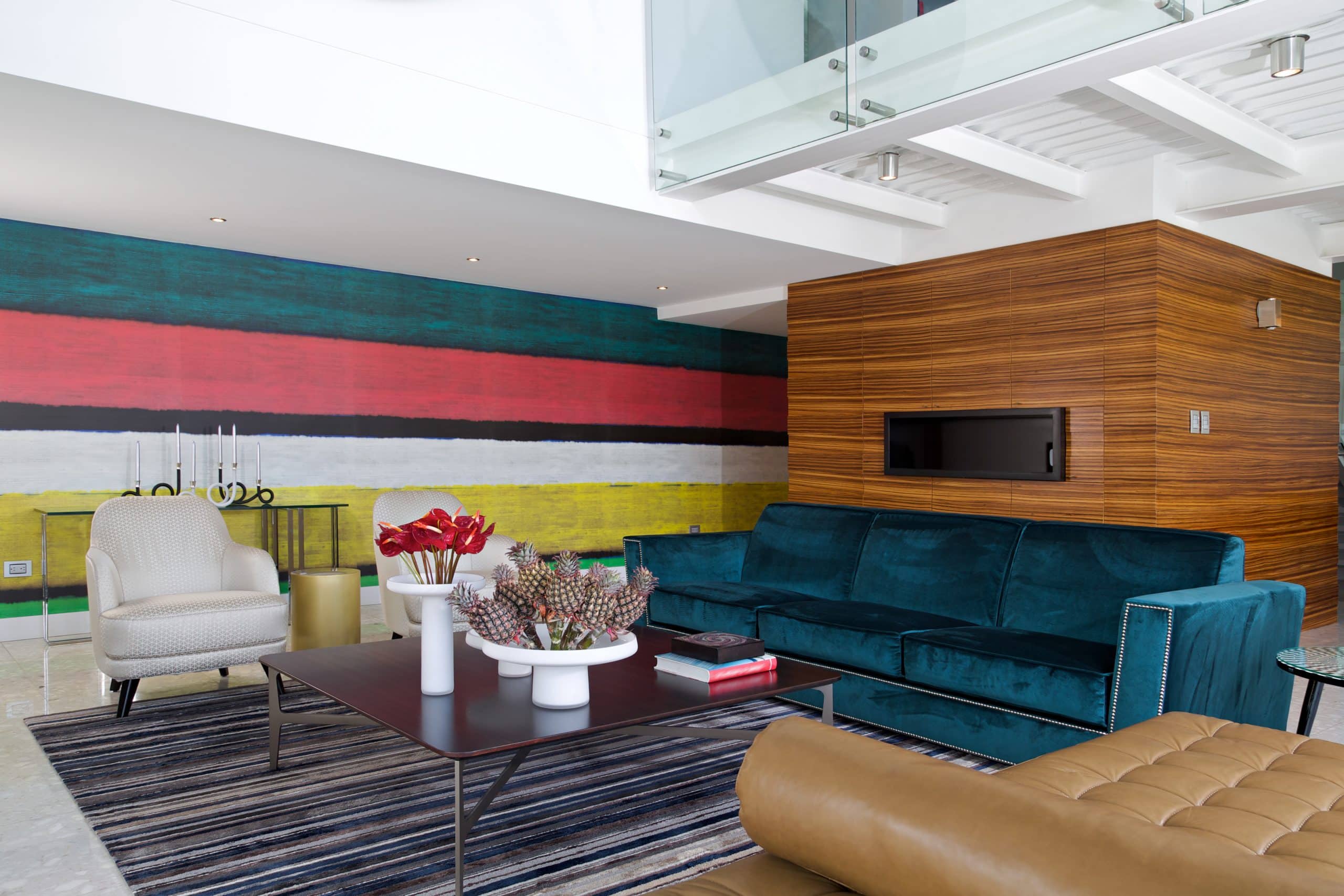 - Salón: Un mural de rayas bicolor tras el sofá principal crea un foco de atención escenográfico, moderno y muy limpio. Aporta profundidad a la estancia y destaca el resto del mobiliario.