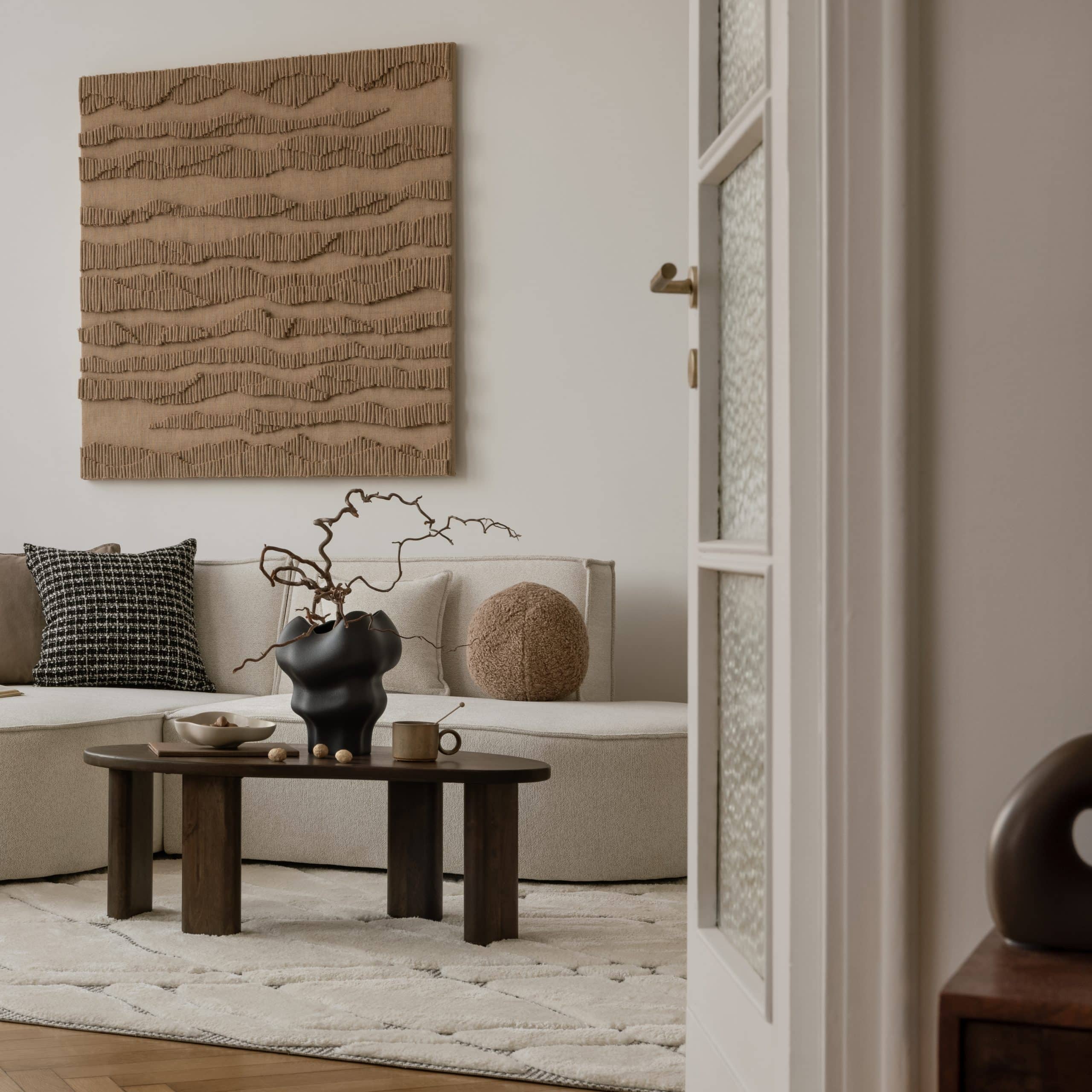 - Texturas confortables y que aportan profundidad en alfombras, cojines, cestas, mantitas…