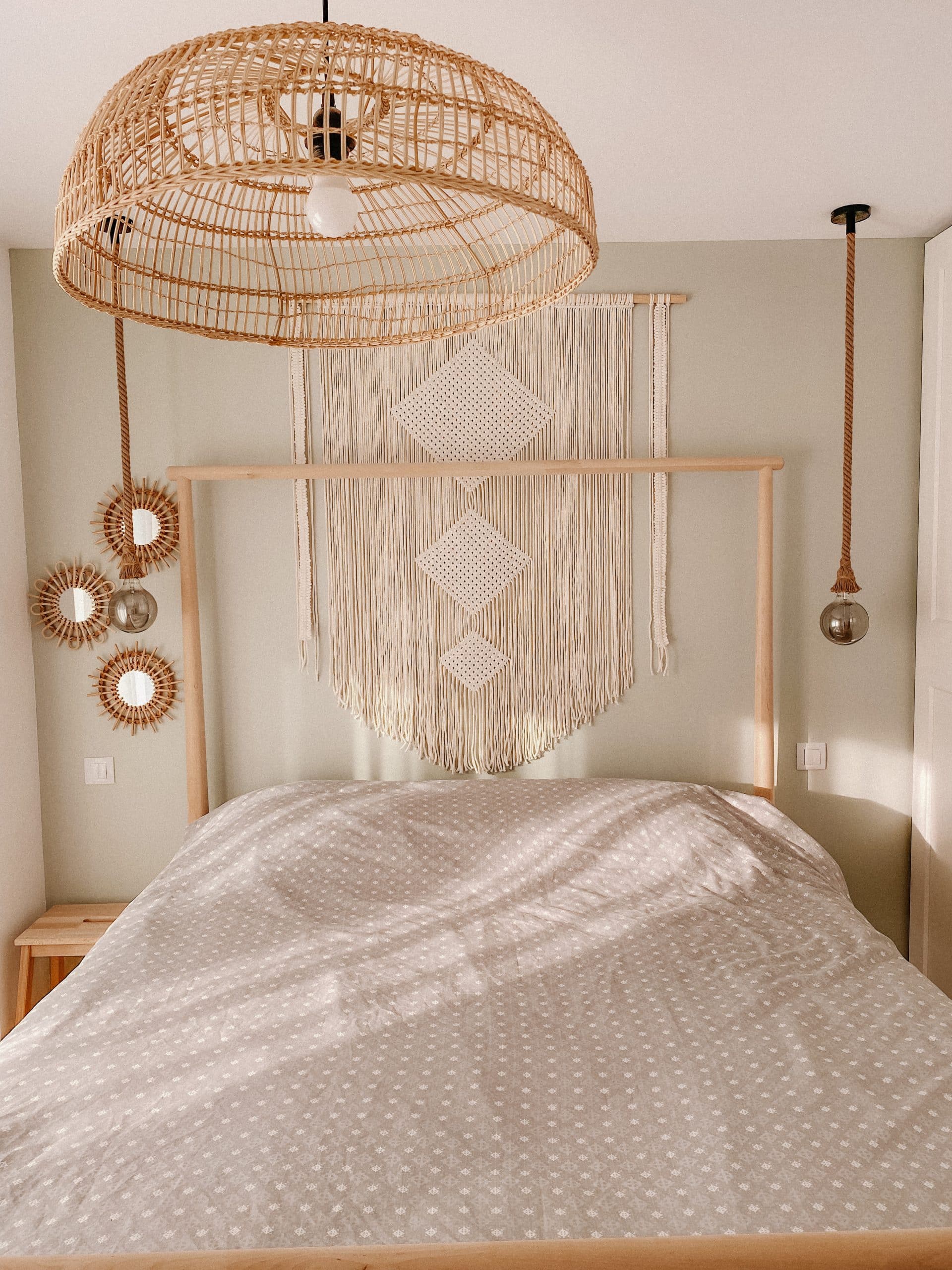 Dormitorios con macramé, grandes lámparas de mimbre o yute, alfombras puramente decorativas en fibras al natural y tonos heterogéneos como las vetas de la madera o los nervios de la piedra o el mármol.
