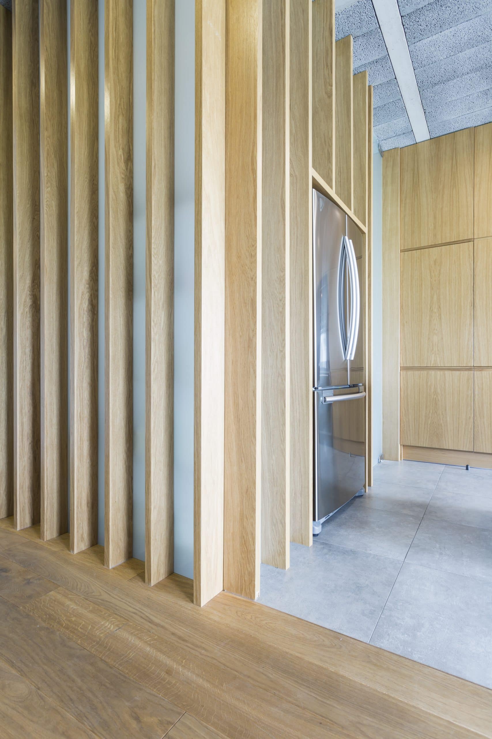 Muchos proyectos de interiorismo estudian el espacio con un único ambiente, sin embargo, quien reside o visita una vivienda, suele recorrerla, o al menos en parte. Hay zonas como los espacios abiertos diáfanos en los que algunos elementos ayudan a simular la conexión visual de la zona de entrada, distribución, escalera, cocina, despacho, living…. Por ejemplo, la palillería o listones de madera, es un tipo de cerramiento muy actual que permite la continuidad visual y la convergencia entre diferentes estancias.
